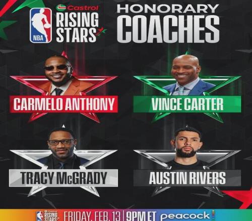 今年全明星新秀赛的荣誉主教练换了一批人,分别是甜瓜安东尼、卡特、麦迪和小里弗斯。